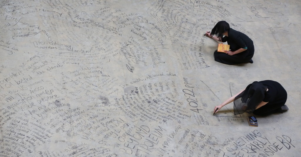 Time Piece is a tide of stories and narratives flowing in waves up the slope of Tate Modern’s Turbine Hall. The texts are fictional and factual responses to art, activism, climate change and the oil industry. The performance explored lunar time, tidal time, ecological time, geological time and all the ways in which we are running out of time: from climate change to gallery opening hours; from the anthropocene to the beginning of the end of oil sponsorship of the arts.