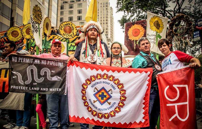 Art Tanderup holding “No Permit, No Pipeline” flag, Shane Red Hawk and his daughter Tasina, Rosebud Sioux Tribe president Cyril Scott, and Jane Kleeb with her family’s ranch brand flag at People’s Climate March. Photo by Jenna Pope.