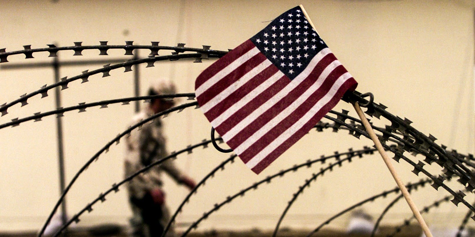 A U.S. Marine walks past an American flag attached to a roll of concertina wire on Dec. 14, 2001, in southern Afghanistan. Photo: Rick Loomis/Los Angeles Times/AFP via Getty
