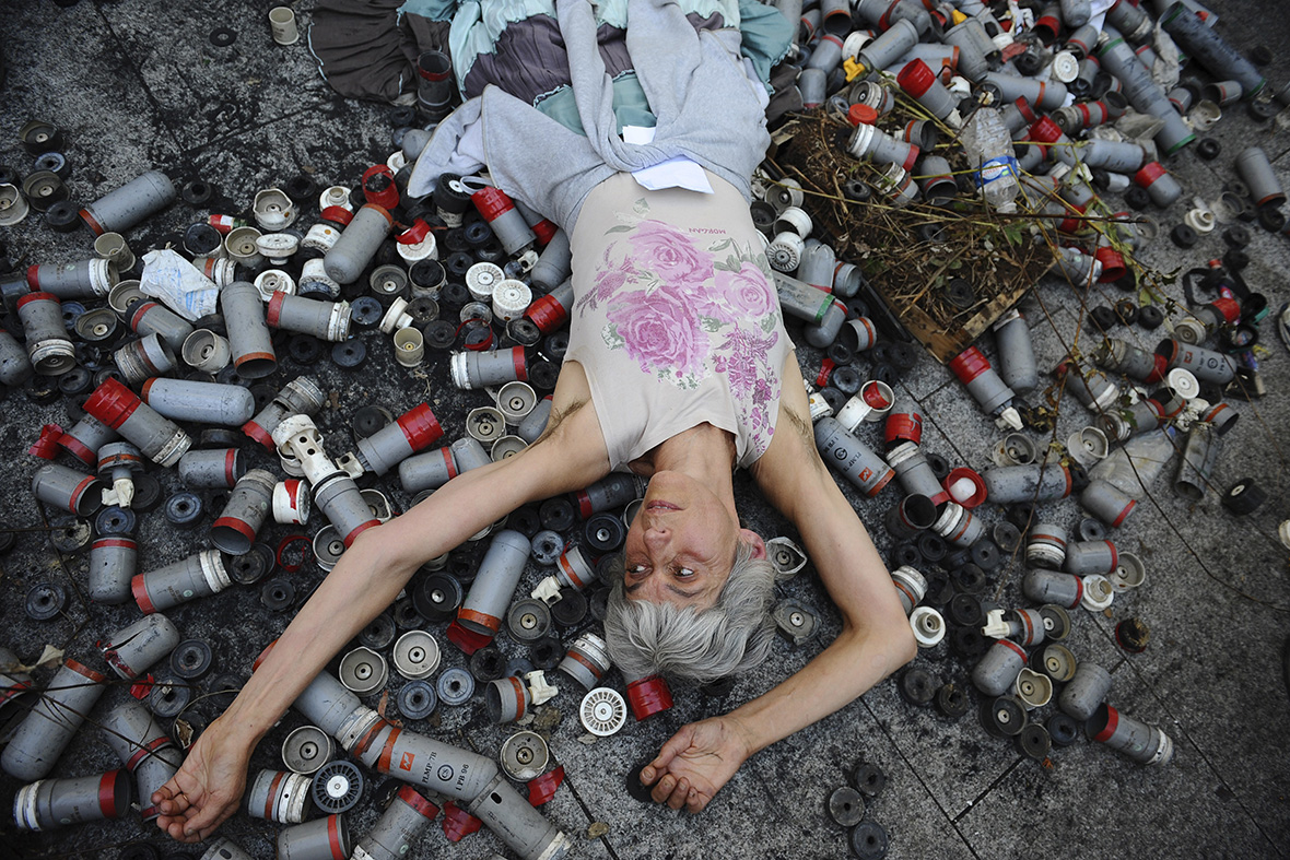 A protester lies on the ground surrounded by tear gas canisters and used flash grenades(AFP)