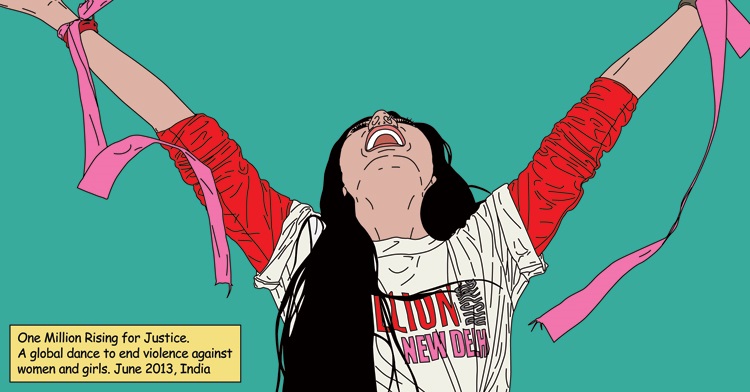 Indignadas (Outraged Women) consists of a visual record of participation of women in public protests around the world, including social movements like 15M (Spain), Occupy Wall Street (NYC), and feminist movements like Femen, Pussy Riot, SlutWalk, and Alfombra Roja (Red Carpet, Peru). I turn photographs from press and witnesses into drawings that I prints onto large format tarps for exhibitions in public spaces.