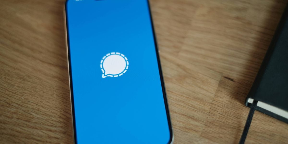 A cell phone sits on top of a wooden table with the Signal app open. (Photo by appshunter.io on Unsplash)