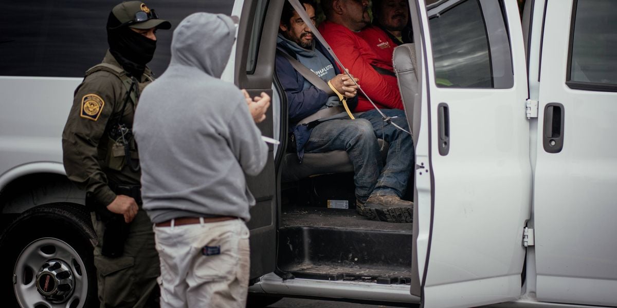 Detained people are taken to a parking lot on the far north side of the city before being transferred to an Immigration and Customs Enforcement facility on October 31, 2025, in Chicago. (Photo by Jamie Kelter Davis/Getty Images)