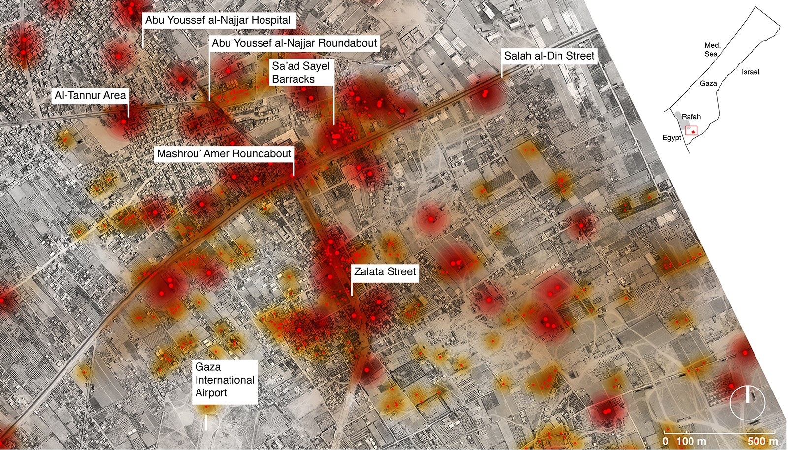 A Pléiades satellite image of eastern Rafah, taken on 14 August 2014 at 11.50am, is marked with air strike craters (large red dots) and artillery craters (small red dots) and the resulting intensity of attacks (shades of red). © CNES 2014, Distribution AIRBUS DS, all rights reserved.