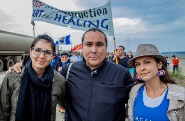 Clayton Thomas-Muller with Eriel Deranger of the Athabasca Chipewyan First Nation (left) and Melina Laboucan-Massimo of the Lubicon Cree Nation (right). Photo by Zack Embree.