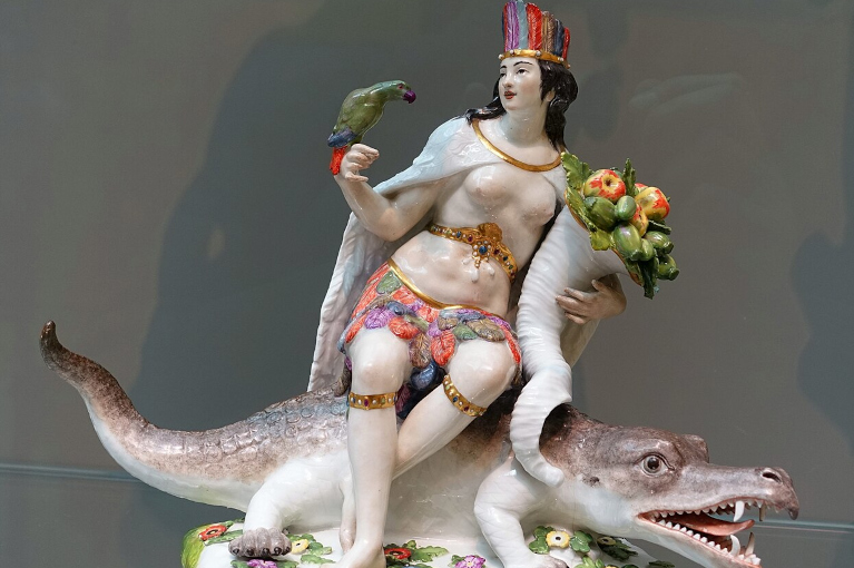 Teaser photo credit: Rococo personification of the Americas with an alligator, a parrot, and a cornucopia, all symbols of the New World, designed by Johann Joachim Kändler and produced by the Meissen Porcelain Factory, c.1760, porcelain, Wadsworth Atheneum, Hartford, Connecticut, US. – Daderot, Public Domain