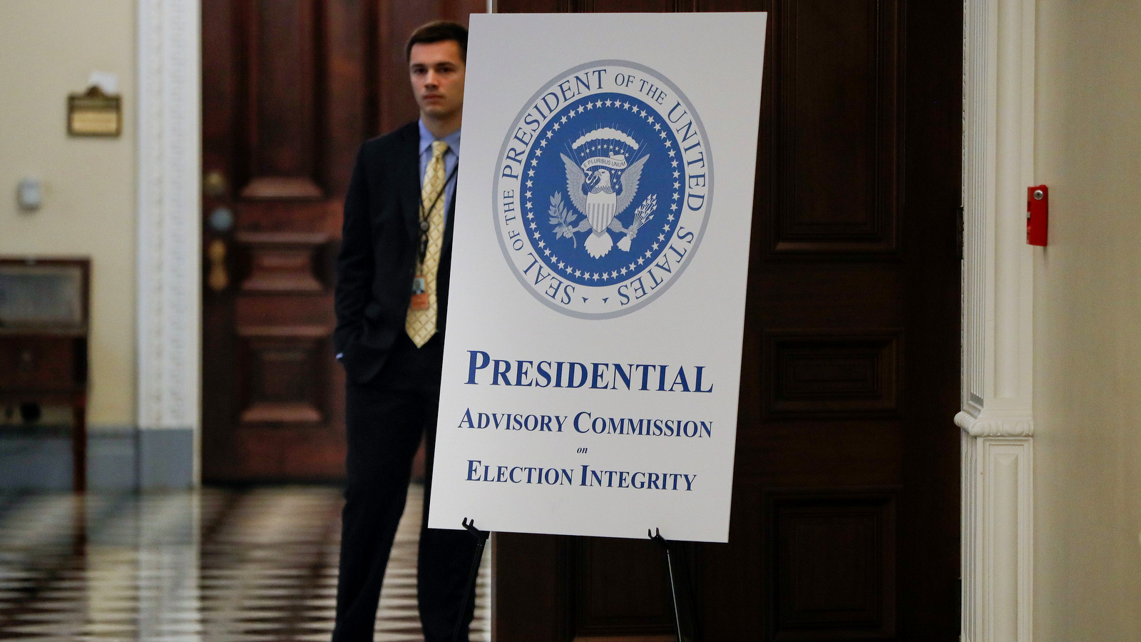 A Sign outside the room for the first meeting of the Presidential Advisory Commission on Election Integrity, where President Donald Trump and Vice President Mike Pence will attend, Wednesday, July 19, 2017, in the Eisenhower Executive Office Building on the White House complex in Washington. (AP Photo/Pablo Martinez Monsivais)