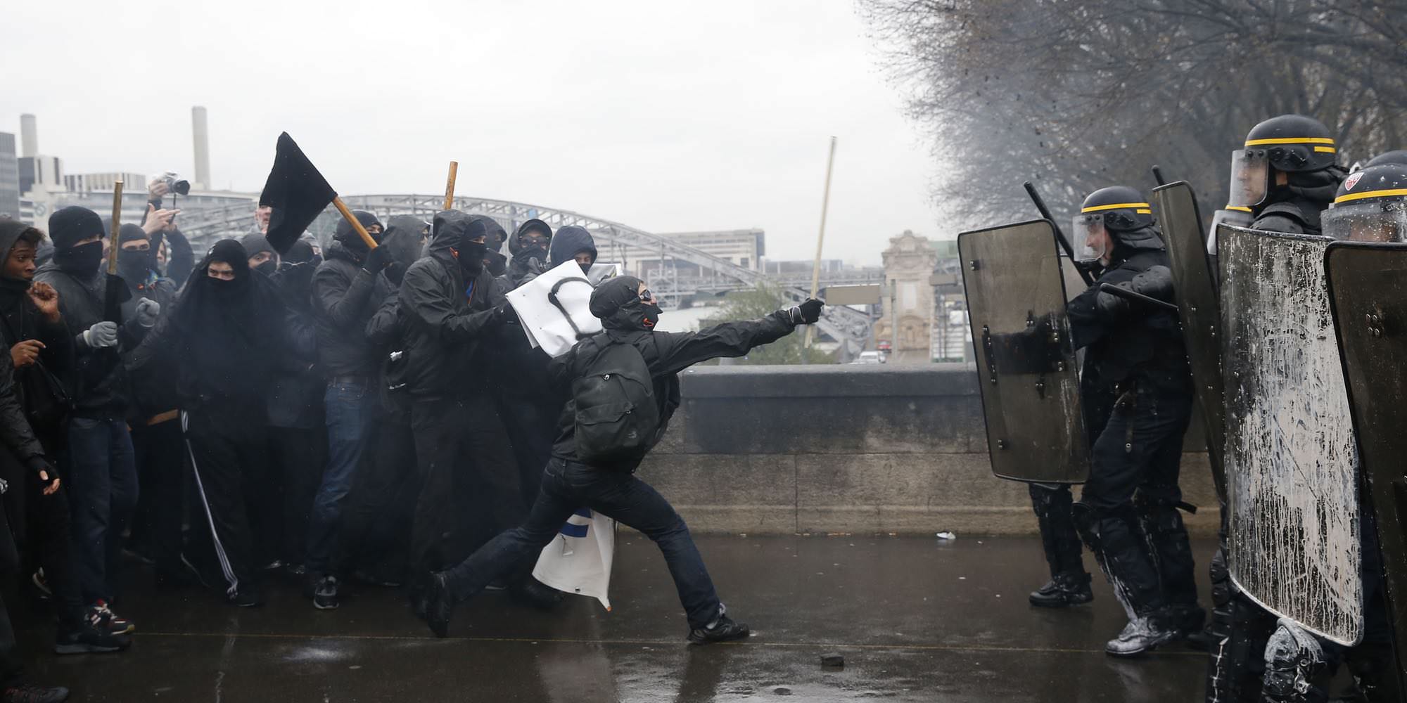 A national coordination of students organized a protest for the afternoon of April 14. The initial route was to connect Place de la Bataille de Stalingrad to Place de la Bastille. As usual, groups of students, anarchists, and members of the Ultraleft met in the morning at Place de la République with the intention of initiating a wild action that would end by joining the afternoon’s authorized demonstration. On their way to Stalingrad, the march attacked numerous symbols of capitalism and the state. Upon reaching Stalingrad square, the march faced numerous police squads that were already surrounding part of the afternoon demonstration. It seemed that the police had received orders to contain the crowd and to block or delay the protest’s departure. Deciding not to let the police divide us, we started confronting the closest police lines in order to create a breach that would allow all the demonstrators to join together.
