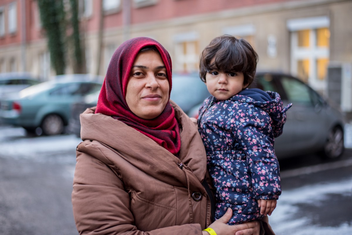 Zahra, a refugee from Iraq, embraces her 9-month-old girl. She came to Germany alone with her two children, while pregnant with her third child.