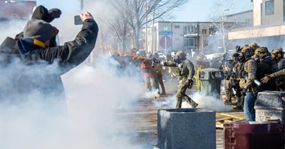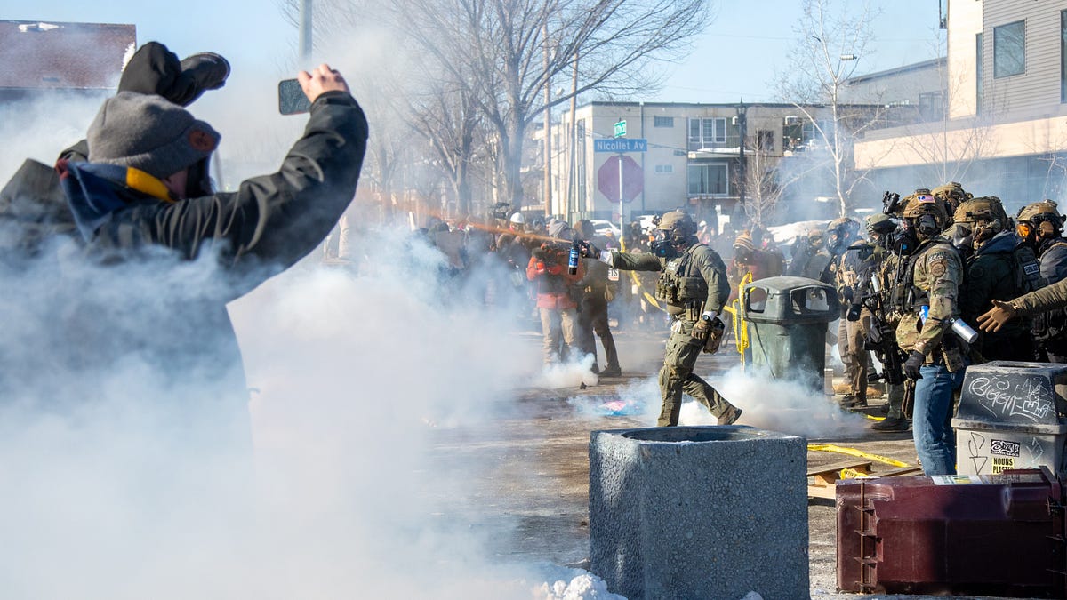 Protesters clash with law enforcement after a federal agent shot and killed a man on Jan. 24 in Minneapolis (Photo by Arthur Maiorella/Anadolu via Getty Images)
