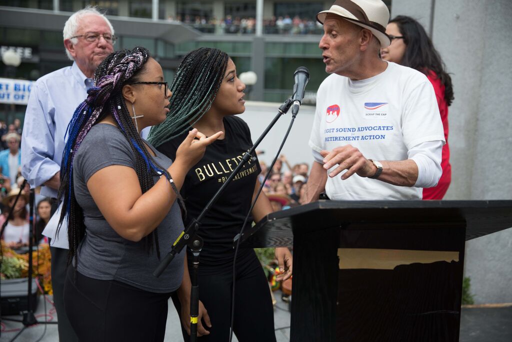 Two black women who said they were representing the Seattle Black Lives Matter movement interrupted a rally that had been planned by a multicultural coalition that wanted to celebrate Social Security and Medicare. The main speaker at that rally, presidential candidate Bernie Sanders, was an older white man who, two weeks earlier, had tried to communicate his solidarity with the Black Lives Matter movement in a speech to the Southern Christian Leadership Conference, and whose campaign had been working on (but had not yet released) a racial justice platform. Sanders says he will fight harder against racism than any other candidate. One of the protesters who interrupted him, Marissa Johnson, says: "If he's our best option then I'm burning this down."