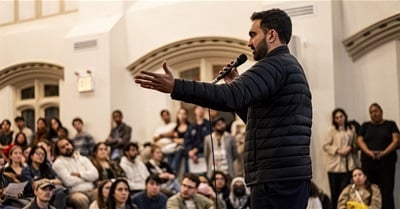 Zohran Mamdani Speaking in 2024 at a DSA 101 Meeting at the Church of the Village in NYC | Image: Bingjiefu He/wikimedia commons