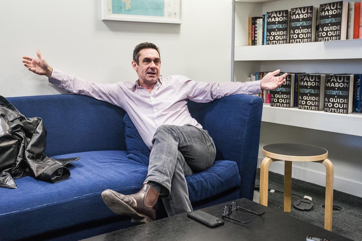 You may recognise Paul from his dispatches on Channel 4 News, reporting from Greece as it gets pushed into a financial abyss, Scotland as it nearly lurched away from the UK and wherever else the tectonic plates of the world economy and politics are shifting. When we met, his experience as a communicator came into play, talking not just with his hands but, at times, seemingly with each limb and facial feature pointing in a different direction. Beneath the relatively traditional delivery style of a public service news-caster lies a radical political mind with its roots in the traditional left – young Mason was a supporter of Workers' Power, a Trotskyite sect – that is perhaps given a little more room to breathe when he writes op-eds for the Guardian or writes books such as his 2012 hit, Why It's Kicking Off Everywhere: The New Global Revolutions.