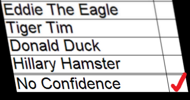 Without a "no confidence" option available, any leadership election also opens itself to accusations of being, in effect, fraudulent. Unless candidates can clearly demonstrate their capacity to motivate followers and to lead them forward together, there is a question of the validity of the election. An election between Donald Duck and Hillary Hamster, for example, would clearly be fraudulent. But somewhere between the black-and-white options of fictitious leaders and fabulous leaders, nestled in the grey of reality, lies a point where real candidates lacking the necessary qualities are simply not capable of taking people either forward, or together, or both. How can a leadership election incapable of delivering a leader be anything other than a fraud? And how can the shades of grey in such situations possibly be reasonably resolved except by giving the citizens who are to be led the opportunity to assess these situations themselves in a robust democratic manner?