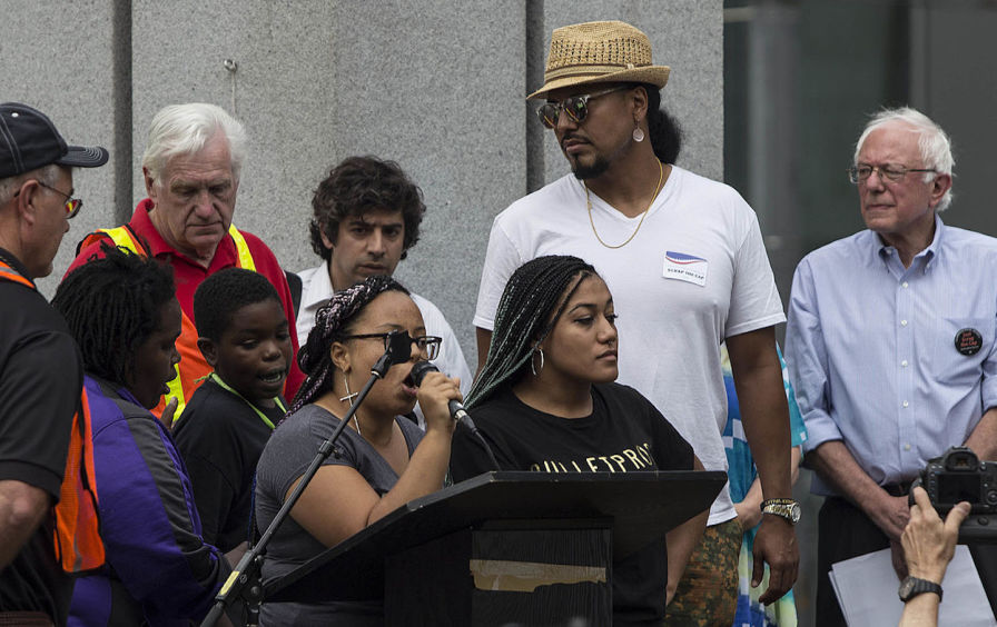 Black Lives Matter activists, including Marissa Johnson (holding microphone), prevent Bernie Sanders from speaking at Westlake Park in Seattle on August 8, 2015. (Wikimedia Commons)