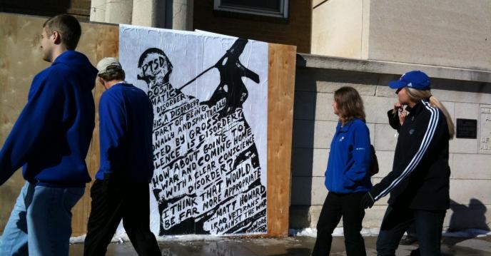 Although traditionally art exhibits tend to stay in the confines of an indoor space, it is only natural that Operation Exposure finds its way to the streets. As the show travels it leaves its mark. This image by Matt Howard, of a soldier's silhouette accompanied by a poem about PTSD remains behind to continue to expose audiences to the growing need for adequate Veteran mental health as conflict rages on. Another piece hauntingly proclaims, "War is trauma." Similarly, Operation Recovery will persist in its pursuit to prevent further damage to be done to these Veterans' wounded brothers and sisters.