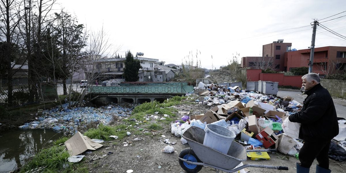 A man looks for goods to retrieve in a dumping area near plastic trash-filled floodwaters following heavy rains, in Durres, Albania on January 13, 2026. (Photo by Adnan Beci/AFP via Getty Images)