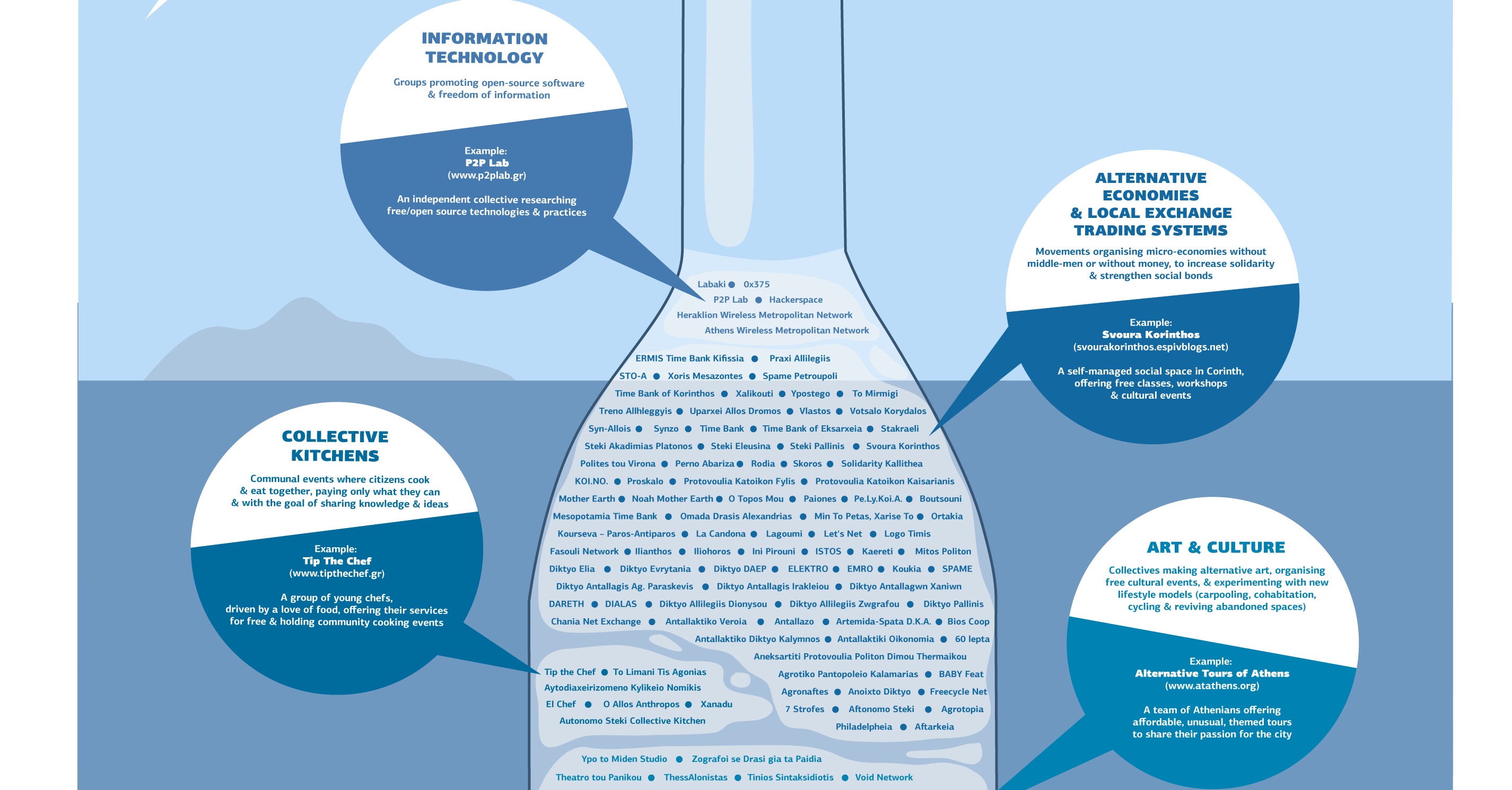 The map is a poster showing all the grassroots groups that are currently active in Greece, split into ten categories from neighbourhood assemblies to education movements to alternative micro-economies, with information on each group and details of an example group in each category. We've also included a list of all these groups in text format, with links to their websites (below).