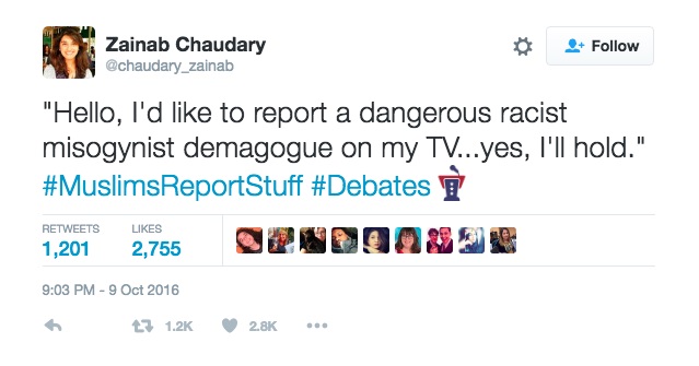 "Hello, I'd like to report a dangerous racist misogynist demagogue on my TV...yes, I'll hold." #MuslimsReportStuff #Debates — Zainab Chaudary (@chaudary_zainab) October 10, 2016