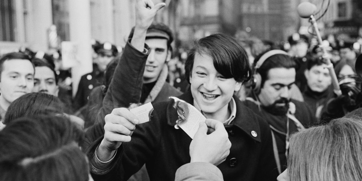 A young man burning a document outside the Armed Forces Induction Centre at 39 Whitehall Street in New York City on 'Stop the Draft Week', in opposition to the military draft during the Vietnam War, 5th December 1967. (Photo by Steve Wasserman/Michael Ochs Archives/Getty Images)