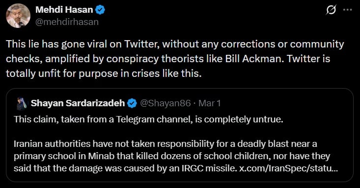 Within hours, a disinformation campaign was underway claiming that Iran's own Islamic Revolutionary Guard Corps had accidentally bombed the school. The claims spread fast. They have since been debunked by The New York Times, NPR, CBC News, Al Jazeera, New Lines Magazine, and PolitiFact.
