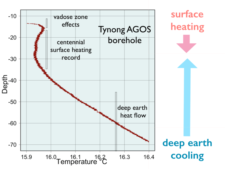 The temperature profile shows various stages. Above the water table at about 15 metres depth, due to infiltration of groundwater in the vadose zone, the temperatures in the borehole rapidly equilibrate to seasonal surface temperature changes. In the winter, when this temperature log was obtained, the temperatures in this shallow zone trend towards the ambient temperature around 12°C. In summer, they rise to over 20°C. Beneath the vadose zone, the temperature in the borehole responds to the conduction of heat influenced by two dominant factors, the changing surface temperature on time-scales of decades to many hundred of years, and the heat flow from the deeper hot interior of the earth. During a rapid surface warming cycle lasting more than several decades the normal temperature gradient in which temperatures increase with depth can be reversed, so that we get a characteristic rollover (with a minimum here seen at about 30 metres depth).
