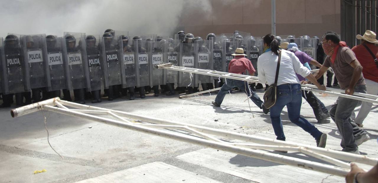 Teachers clashed with riot police in front of the Guerrero state capital building.