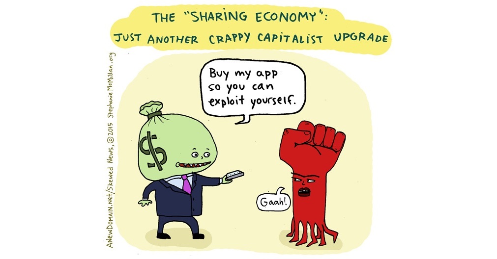 The “sharing economy” is another huge restructuring of the employer/employee relationship that benefits investors at the expense of the masses. Our workdays are being stretched into a series of endless tasks, cobbled together out of freelancing and side hustles, with barely any compensation to speak of. Yet they tell us this is somehow liberatory, that we’re participating in some glorious manifestation of the commons because we have to rent out our bedrooms, drive strangers around in our cars, hawk ourselves with “self-branding,” sell our possessions on eBay for a few bucks, and crowdfund our creative work, while millions in fees are collected by … someone. Someone else. Someone not us. Someone not us who lives in a mansion.