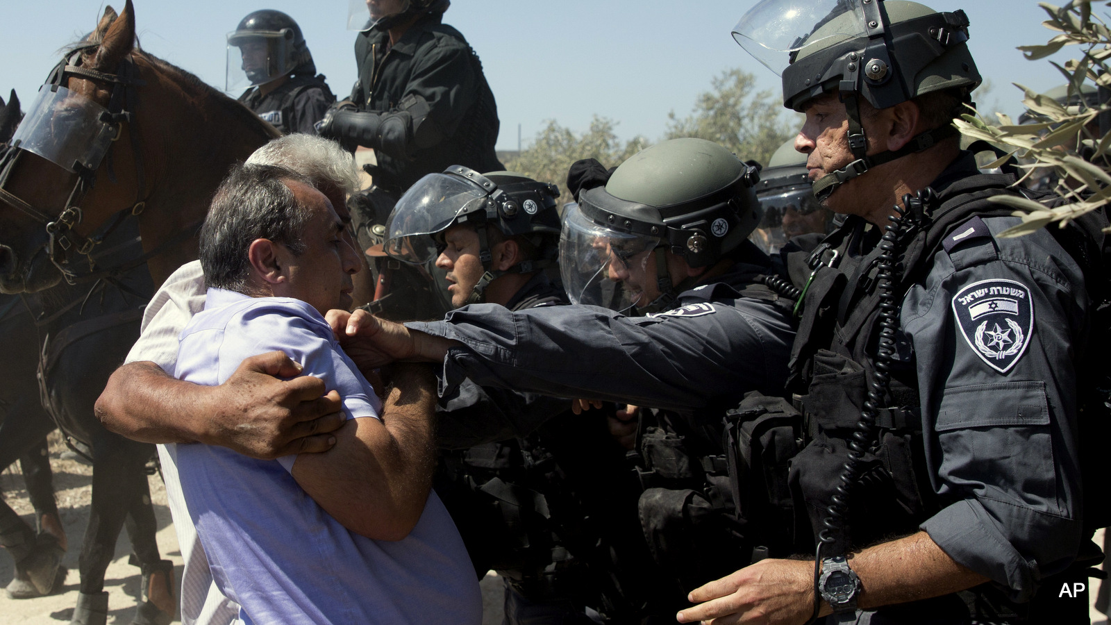Israeli riot police officers scuffle with Arab men in Arab village of Ara, northern Israel, Monday, Sept. 19, 2016. About 50 right wing activists protested in Ara outside the home of Nashhat Milhem, who killed three people in a shooting rampage in Tel Aviv in January 2016 before police killed him in a shootout. The demonstrators demanded Israel deport Milhem’s family and shouted “There is no Palestine.” They arrived under heavy police escort to the village, where locals held a counter demonstration. (AP Photo)