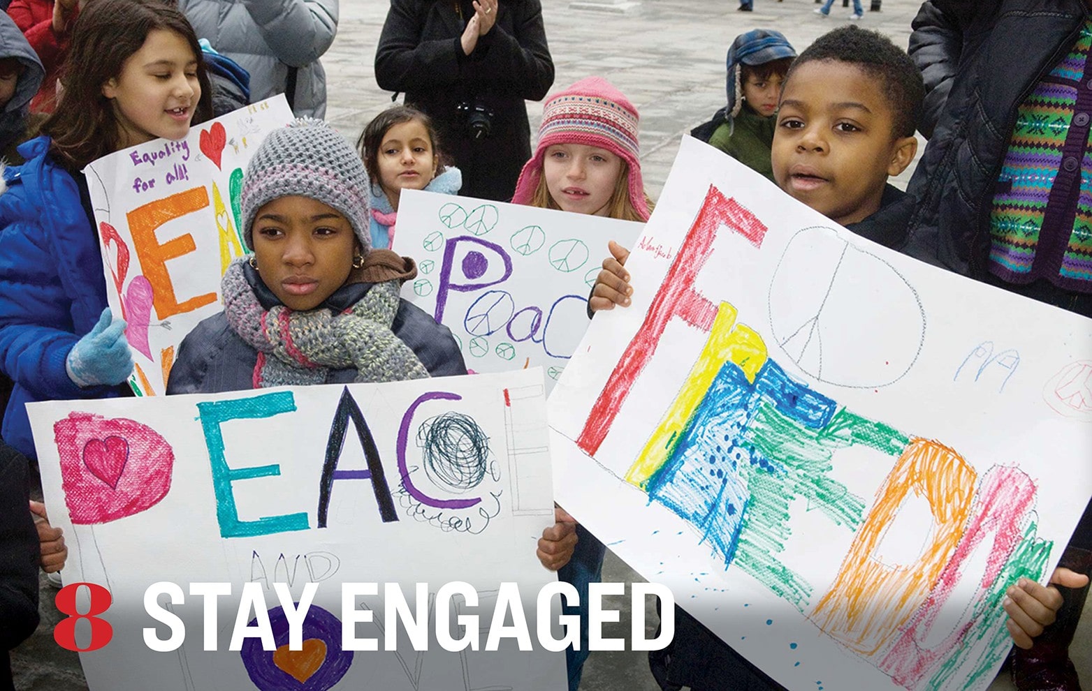 Encourage your children to become activists. They can form harmony clubs, build multicultural peace gardens, sponsor “walk in my shoes” activities, and create ways to interact with children of other cultures.