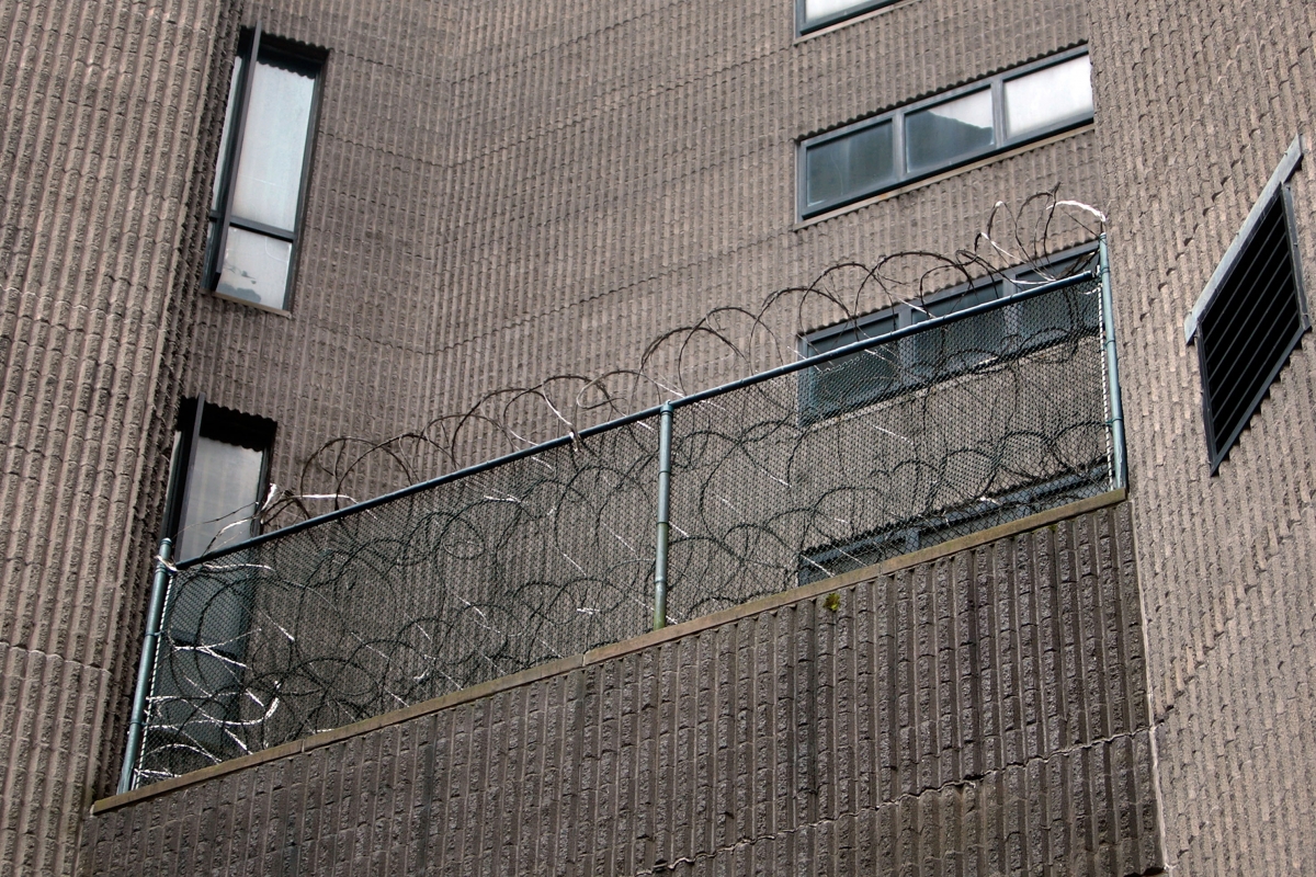 Top photo: Razor wire hangs on a railing at the Metropolitan Correctional Center, June 9, 2009, in New York City.