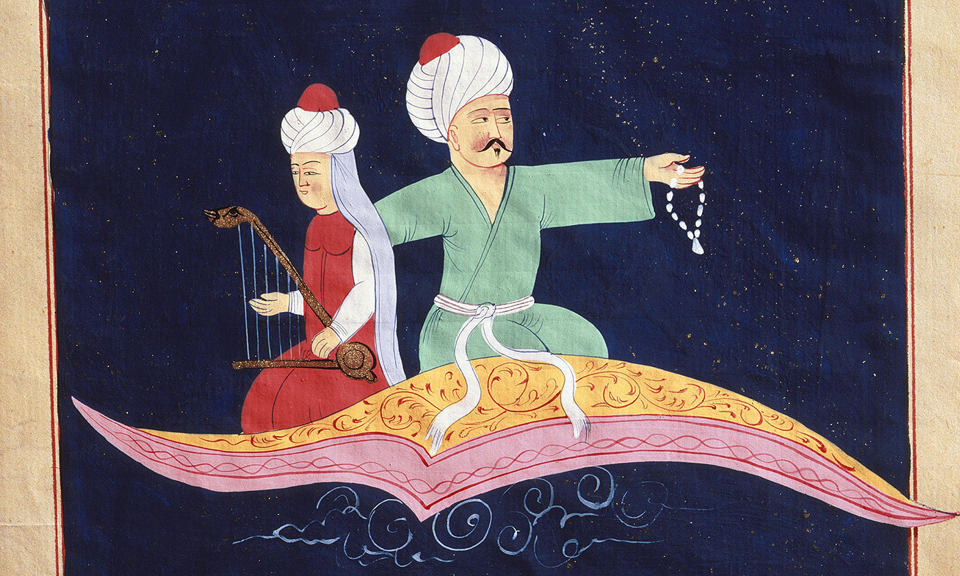 Flying Over Istanbul and the Galata Tower on the Magic Carpet from the 1001 Nights, Turkish miniature, 19th C. Photo by Rex