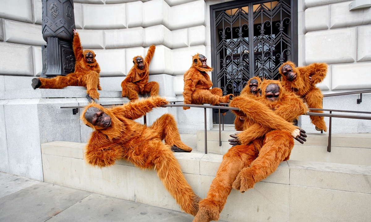 Greenpeace campaigners dressed in orangutan costumes protest outside the offices of Unilever in London, calling for a moratorium on the expansion of oil palm plantations. Photograph: Martin Argles