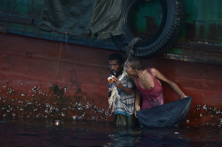 THE UNWANTED. A Rohingya migrant eats food dropped by a Thai army helicopter after he jumped to collect the supplies at sea from a boat drifting in Thai waters off the southern island of Koh Lipe in the Andaman sea on May 14, 2015. Photo by Christophe Archambault / AFP