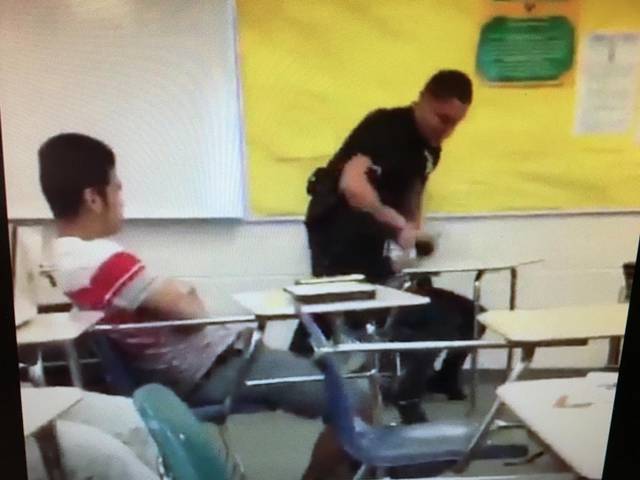 Those were the words of Niya Kenny, the only girl to speak up during a police officer’s attack on her classmate at Spring Valley high school in Columbia, South Carolina. On a cell phone video taken on Monday by one of the students, we can see a police officer approach a girl sitting silently in her chair. He grabs her by her neck, flips her violently backward on her head while she’s still sitting down, and then drags her by her knee before turning her over and jumping on her back.