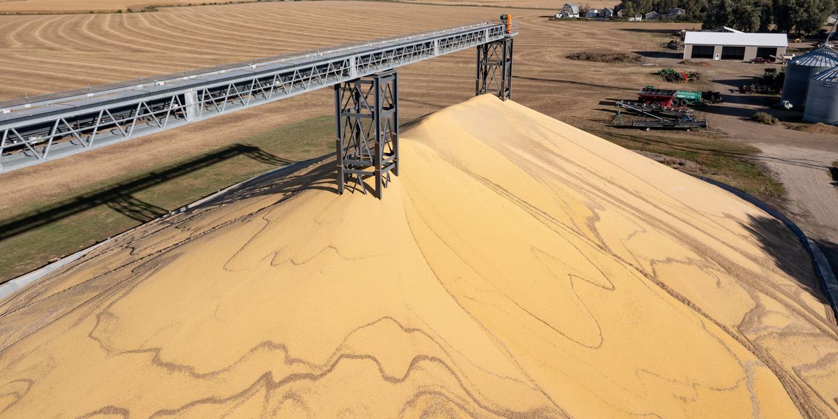 Newly-harvested corn is piled up at a Cooperative Farmers Elevator in Inwood, Iowa. (Photo by Jim West/UCG/Universal Images Group via Getty Images)