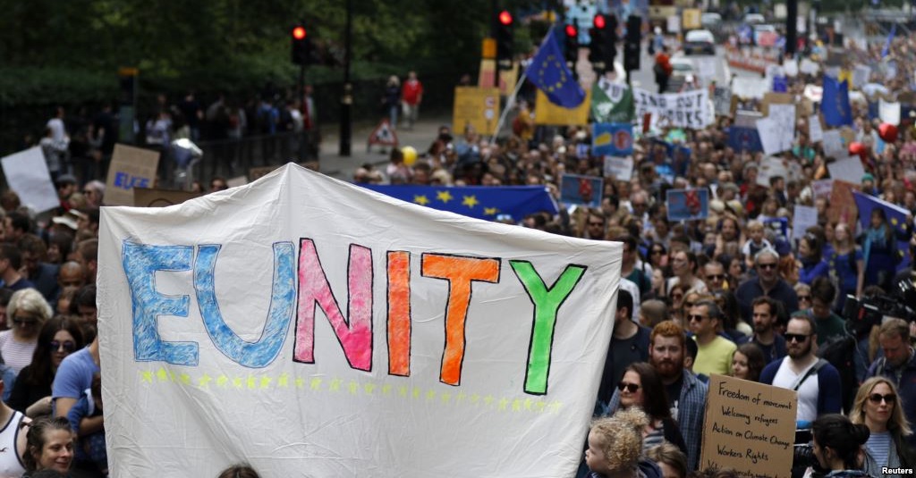 People hold banners during a "March for Europe" demonstration against Britain's decision to leave the European Union, in central London, Britain, July 2, 2016. Britain voted to leave the European Union in the EU Brexit referendum.