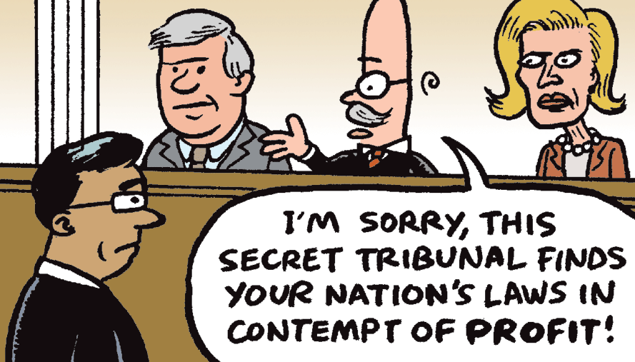 The Trans-Pacific Partnership, or “TPP,” may sound like a boring subject to some Americans, but the details are alarming. Leaked documents show that the agreement would allow multinationals to sue any country whose laws they claim stand in the way of profits. These companies’ challenges to environmental regulations, worker safety laws, and other protections, would be hashed out in private tribunals that operate outside of established legal systems. Obama has staunchly defended the secret agreement and is pushing for fast-track approval, alienating many in his own party. Which makes me wonder: WTF? See more excellent comics at Fusion Graphic Culture.