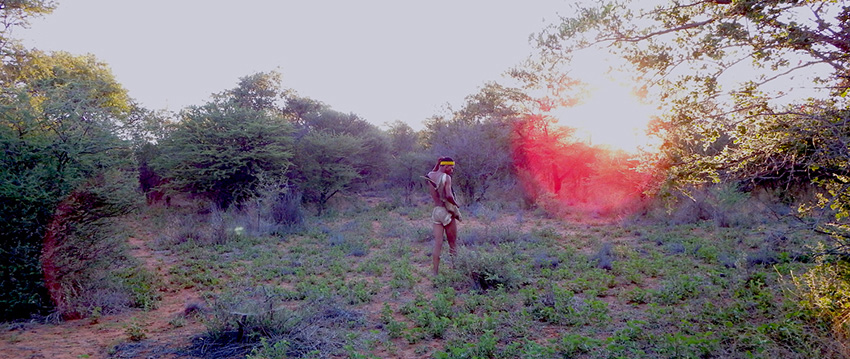 Photo: Tshegu walking the bush in traditional bushmen attire (credit: Miriam Mannak)