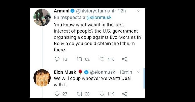 Evo Morales read Musk’s tweet about the coup in Bolivia and responded: “Elon Musk, the owner of the largest electric car company, says about the coup in Bolivia: ‘We will coup whoever we want.’ Another proof that the coup was about Bolivian lithium; at the cost of two massacres. We will always defend our resources!”