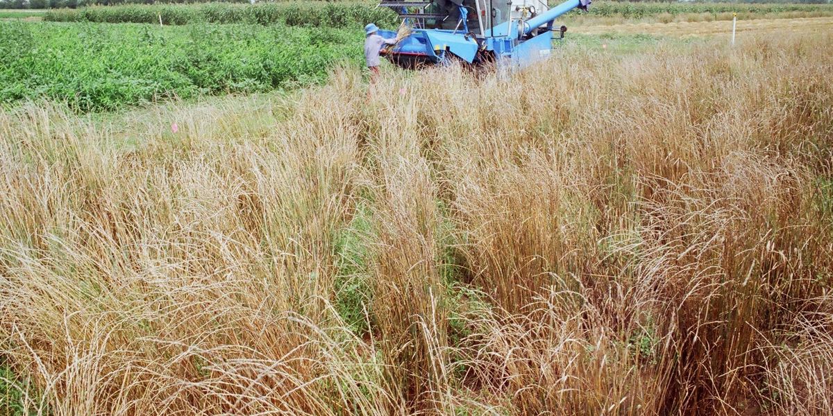 The harvesting of a Thinopyrum intermedium breeding nursery is shown at The Land Institute, which Wes Jackson co-founded. (Photo by Dehaan - Scott Bontz/ via Wikipedia/ CC BY 3.0)