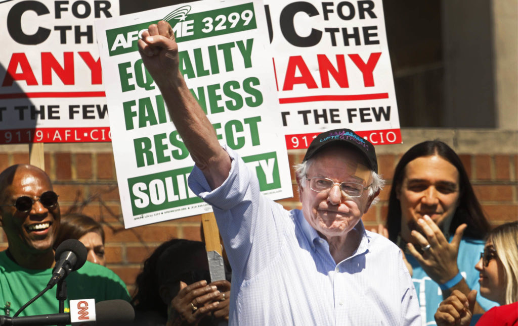 Some of the most populous states have now passed $15 an hour minimum wage laws, once considered a pipe dream, including New York, New Jersey, California, and Illinois, covering over 30 percent of the nation’s population. The senator’s campaigning helped workers over the top in forcing Amazon, Disney, and other large corporations to adopt labor’s $15 an hour demand, and the campaign has helped union workers win contracts at Verizon, Disney and elsewhere. States and cities around the country have already implemented parts of Sanders’ agenda: free college in San Francisco (and to a lesser extent New York), expunging criminal records of drug offenders in Philadelphia and elsewhere, among a wide variety of other ripple effects. And while it would be over-the-top to attribute the self-organized teacher strikes in West Virginia, Oklahoma, and Arizona to Bernie’s campaign (the credit for that inspiration goes much more directly to the Chicago teachers and other left-leaning teachers’ locals), it’s hard to dispute that Bernie’s campaign has helped energize nearly every type of organizing in this country.