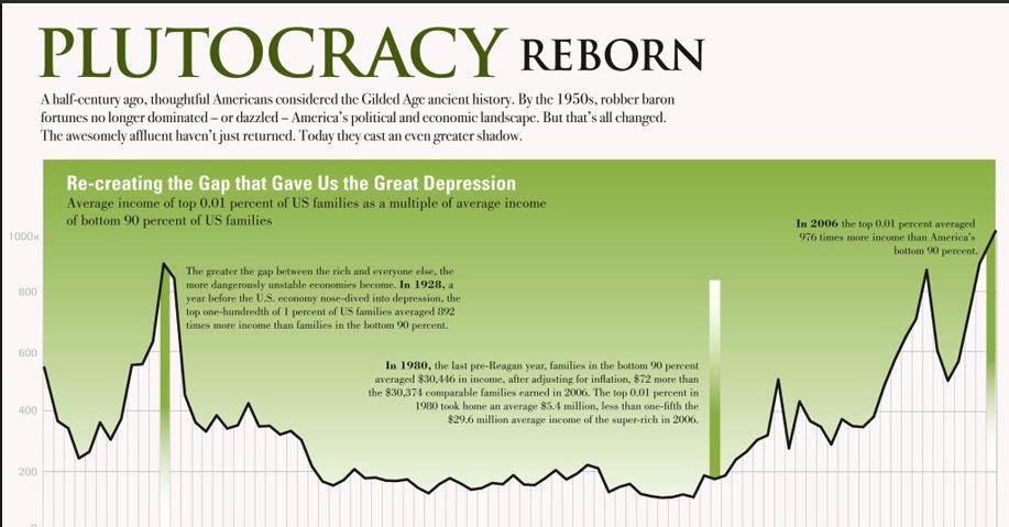 In the presentation, charts indicate that policy changes changed the distribution of wealth towards a plutocratic society. Beginning in the 1980's, the tax for highest earners began to decrease leading to a large gap to grow between the top .01% of America and the rest of the nation. Over time as income grew in America, only the top 10% benefited.