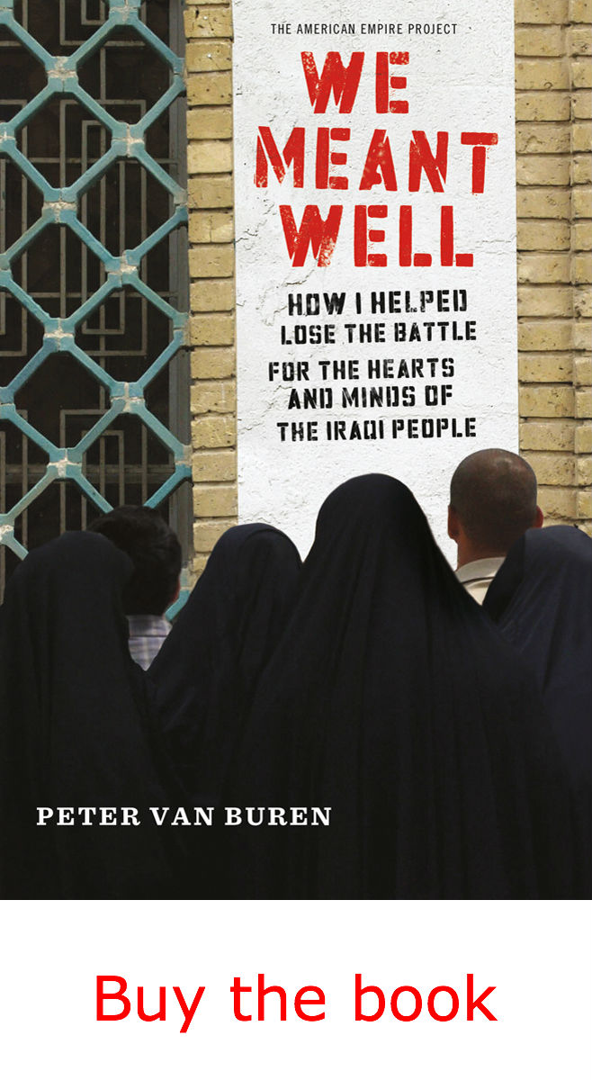Peter Van Buren spent a year in Iraq as a State Department Foreign Service Officer serving as Team Leader for two Provincial Reconstruction Teams (PRTs). Now in Washington, he writes about Iraq and the Middle East at his blog, We Meant Well. His new book is We Meant Well: How I Helped Lose the Battle for the Hearts and Minds of the Iraqi People (The American Empire Project, Metropolitan Books).