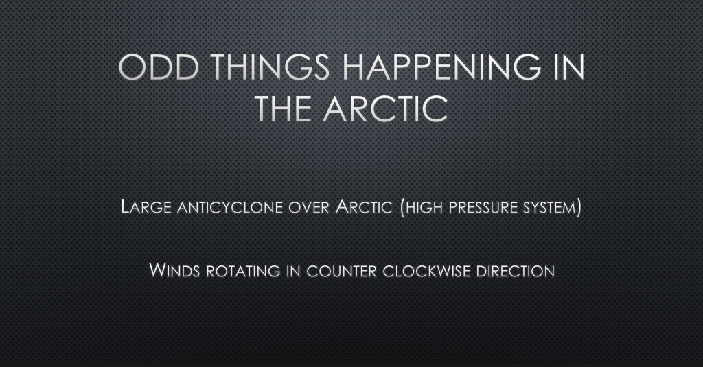 A very large high pressure system in the Arctic has counter clockwise winds. (In the northern hemisphere high pressure systems should have clockwise winds.)