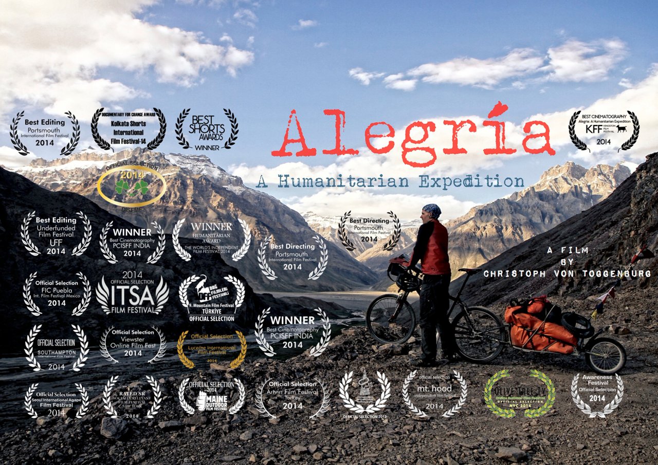 Alegria - A Humanitarian Expedition tells the story of an epic solo expedition across the Himalaya that changed the life of hundreds of people in need. Supporting leprosy patients and mentally destitute women in India, Christoph von Toggenburg cycled 3200km on the world’s highest tracks pulling a 40kg trailer packed with survival gear.