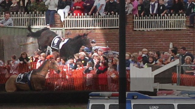 Jumps racing just got even more dangerous. 7 people are now hospitalised after a horrific accident at Warrnambool today that saw Banna Strand jump a fence and crash into a crowd of punters. http://www.AnimalsAustralia.org This video contains strobing effects.