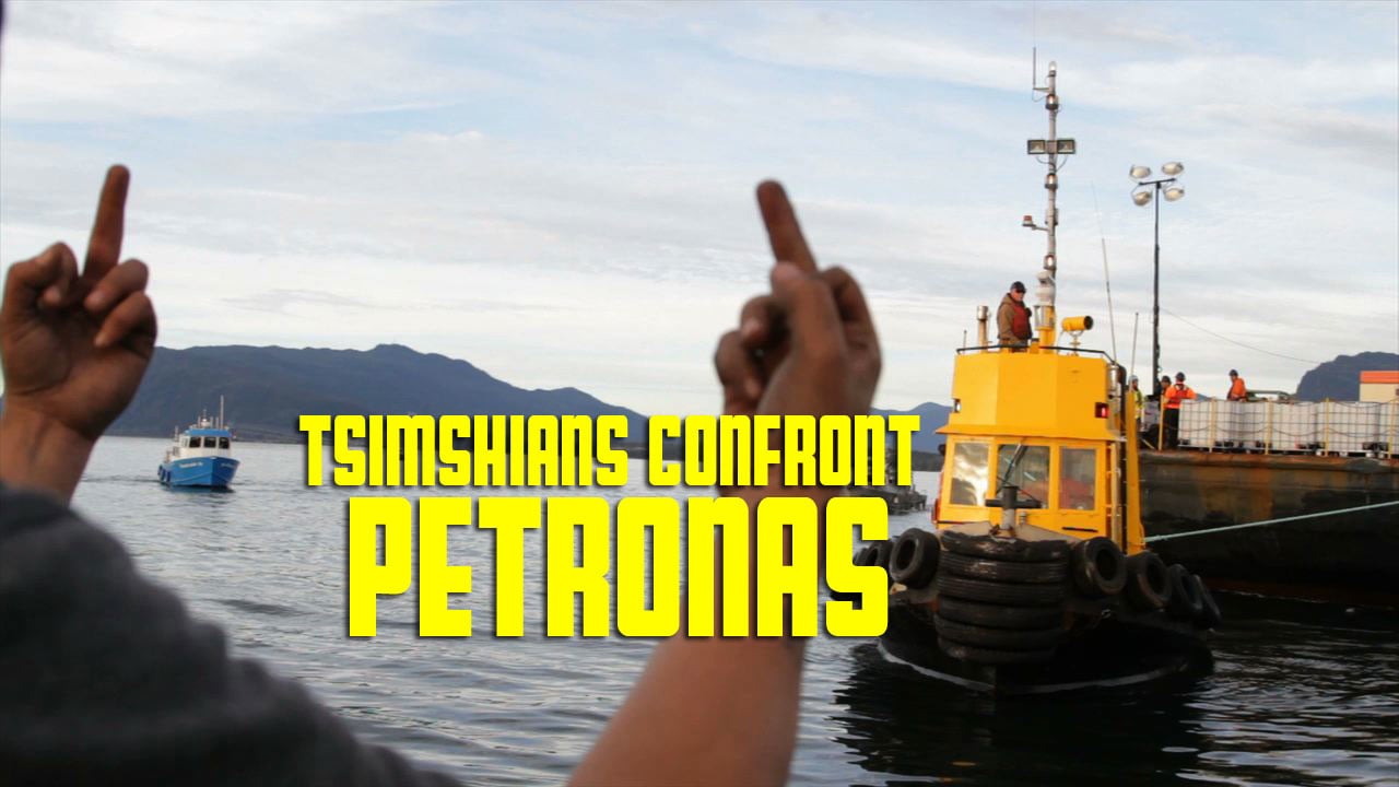 subMedia.tv witnessed the fierce spirit of the Tsimshian people and their supporters as they faced off with the RCMP, Prince Rupert Port Authority and Petronas LNG workers. The Tsimshiams attempted to disrupt the delivery of a barge with surveying and drilling equipment. The surveyors are subcontractors for Petronas, a Malaysian owned company that wants to build a fracked gas facility on Lelu Island, unceded Tsimshian territory. The Tsimshians have occupied Lelu island and have built a protection camp, to defend the island, and the Flora banks, a sensitive eco-system essential for the survival of juvenile salmon and migrating crustaceans. The Tsimshians have called on supporters to come to Lelu Island and stand with them, bring boats or send money and supplied. For more information visit Stop Pacific NorthWest LNG/Petronas on Lelu Island.