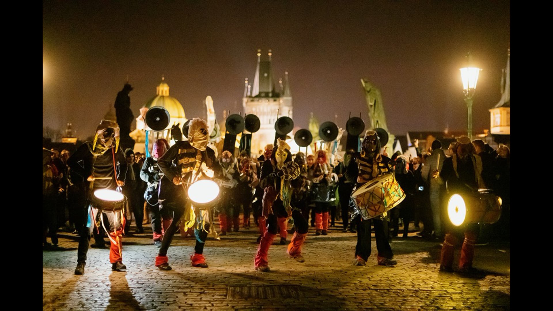 In his book A Secular Age (2007), the influential Canadian philosopher Charles Taylor offers brief reflections on the place of festivity in public culture, describing it as “one of the new forms of religion in our world.” Taylor discusses the importance of moments in urban life where the boudnary between “solitude and communication… sometimes flip over into common action.” Sporting events, rock concerts and festivals are among Taylor’s examples. There is great need within our mechanized, atomized, secular culture, observes Taylor, for moments of transcedence and the experience of collective action and solidarity. In an earlier work (Performing the Reformation, Oxford University Press), I discussed in-depth the dimensions of sociability, communitas, conviviality and transcendence in a new festival culture in Wittenberg, Germany. Far from advocating transcendence at all costs–for example, in the complete erasure of self through absorption in to the group, or the in the high that often accompanies participating in mob violence–the horizontal flattening that has accompanied the processes and structures of modernity nevertheless provokes the effort to attain or insert some element of verticality in to one’s life. Many festive cultures, especially those modelled in part on Carnivelesque elements, aspire to such heights, to, as Taylor puts it, generate “moments of fusion in common action/feeling, which both wrench us out of the everyday, and seem to put us in touch with something exceptional, beyond ourselves. Which is why some have seen these moments as among the new forms of religion in our world. I think there is something to this idea…” I do too, but, a shortcoming in Taylor’s account is that it is just that–an account. He tells, rather than shows, he claims rather than argues. I agree in many respects with Taylor’s analysis, but it is worthwhile to ground his insights in some empirical data and on-the-ground instances of the phenomenon about which he speaks. This fim then is a frontstage-backstage look at BRUiTAL's participation in the 2019 version of Prague's Velvet Carnival. Velvet Carnival is an annual masked satirical parade in Prague. BRUiTAL is a trance drumming group from Belguim.