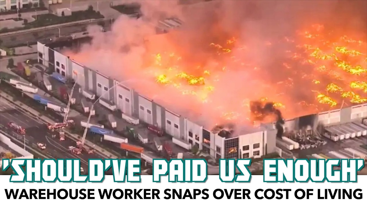 A warehouse worker is in custody following a video he recorded of himself setting fire to the warehouse he worked at while stating they "should’ve paid us enough to live".